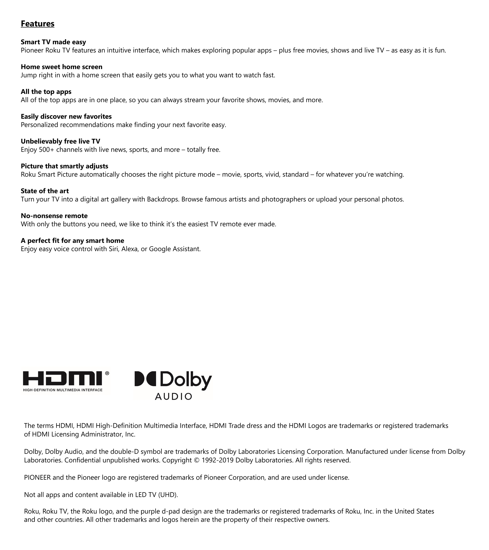 Elevate your viewing with this Pioneer Roku TV and enjoy an effortless smart TV experience. Stream your favorite shows and live channels from the home screen. Our flat screen TVs are designed to deliver stunning entertainment with simplicity at the core.